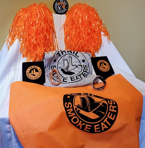 Trail Smoke Eaters reusable tote bag with a t-shirt, two wrist bands, two koozies, two pom-poms, and a hockey puck. Everything you need to cheer on our local hockey team!
